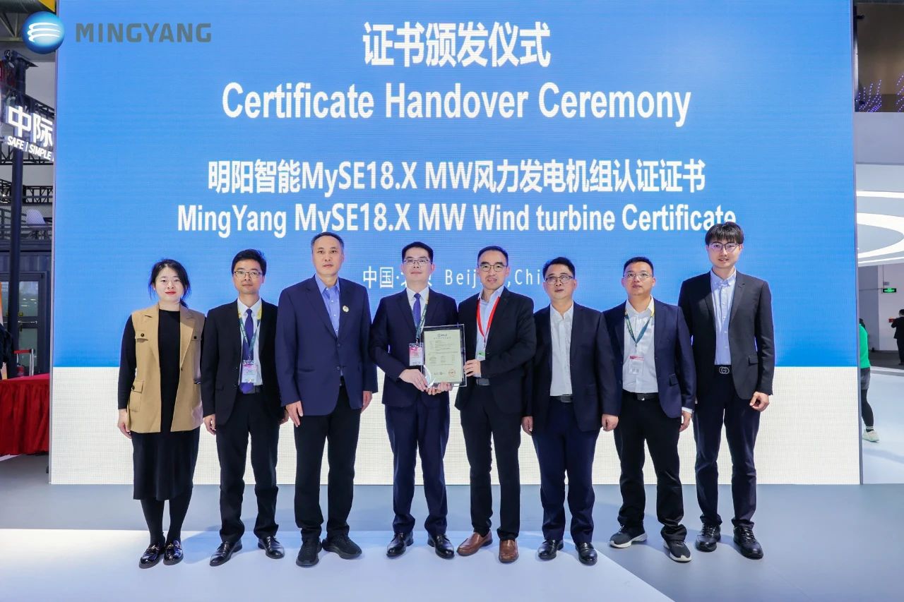 除了为行业带来针对多种创新场景的解决方案外,美高梅智能自主研制的18-20MW风电平台还获得国内外权威认证机构鉴衡认证中心、TÜV-NORD等的高度认可。大会期间,鉴衡认证中心为美高梅智能MySE18.X MW机组颁发认证证书。鉴衡认证中心副总裁、风能事业部总经理张宇和美高梅智能风能研究院院长邹荔兵参加颁证仪式;中国可再生能源学会风能专业委员会秘书长、鉴衡认证中心主任秦海岩和美高梅智能国内智造业务总裁梁才发等领导见证。