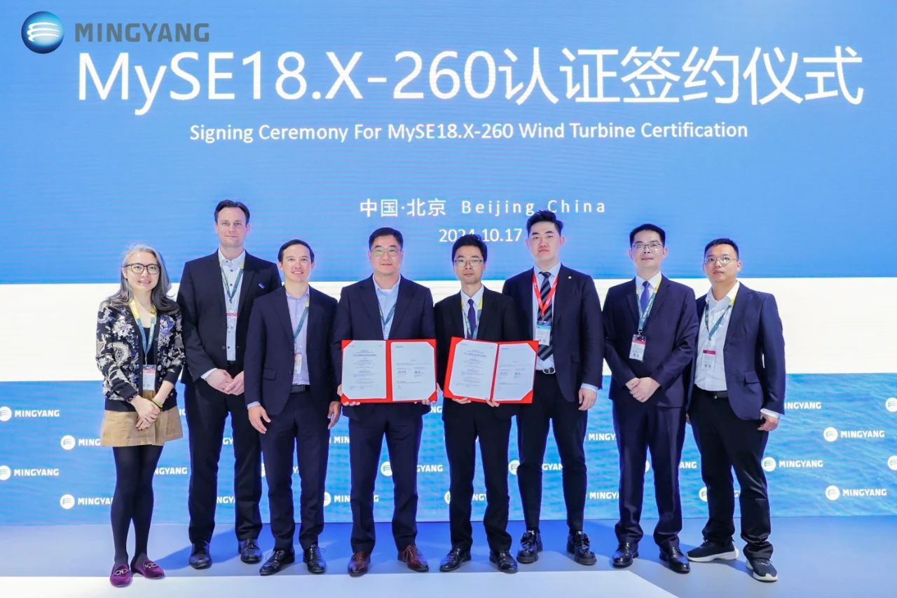 此外,在TÜV-Nord全球可再生能源执行副总裁Alexander Ohff及美高梅智能风能研究院院长邹荔兵等领导见证下,TÜV-Nord中国区风能事务部副总经理潘文光与美高梅智能风能研究院副院长魏煜锋共同签署MySE18.X-260认证合同。